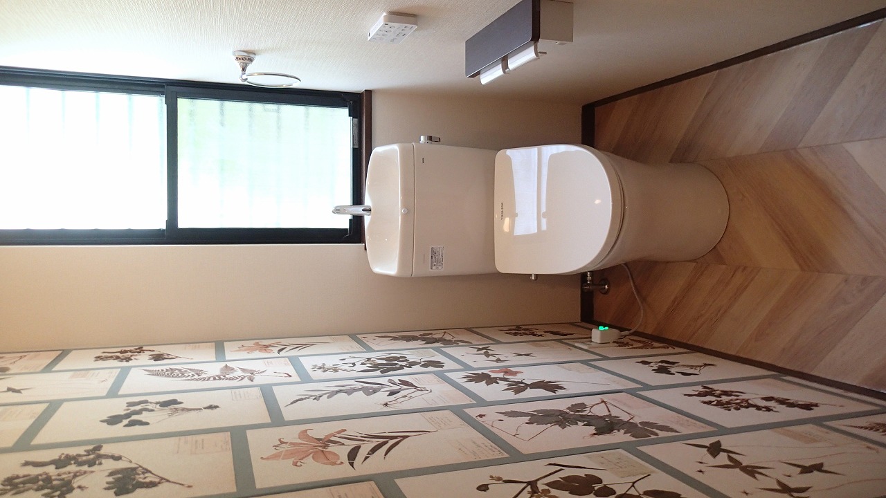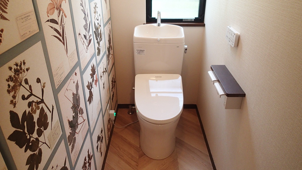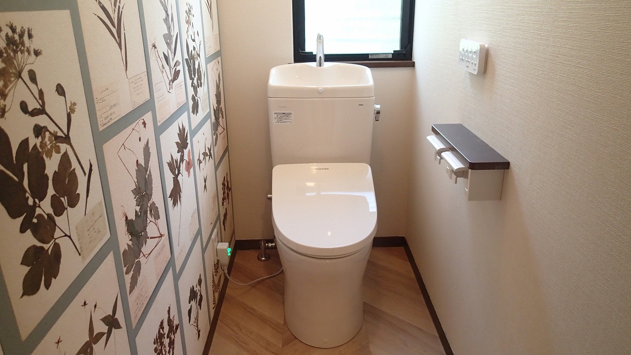 トイレ側面のアクセントクロスは博物館の押葉標本の中で、日本固有の植物をテーマに集めた壁紙。ヘリンボーン柄のクッションフロアとの組み合わせでモダンな空間になりました。