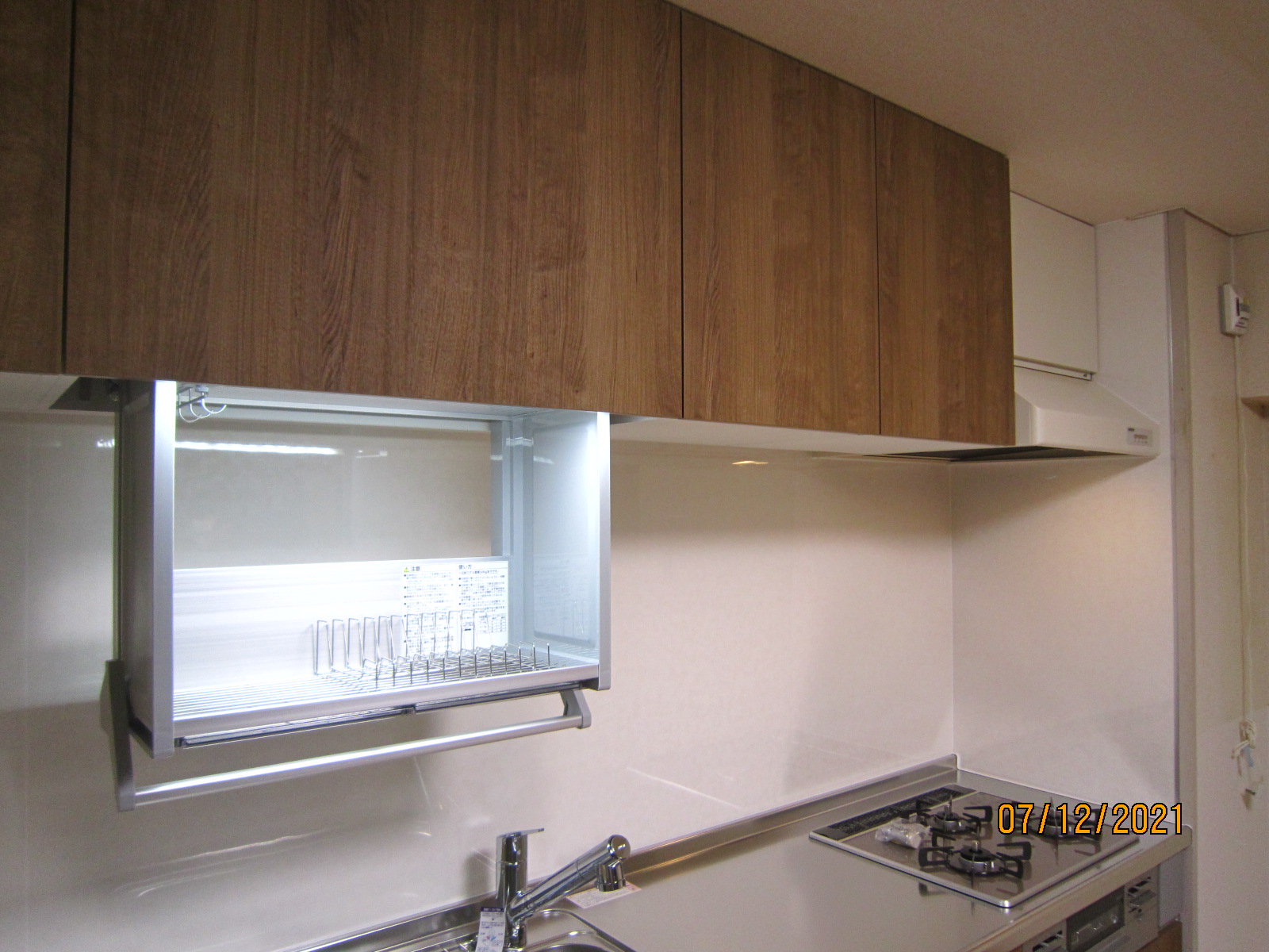 吊戸棚は収納としての使い勝手の部分と、必要な時だけ下へ引き出して、水切り棚のような使い勝手の出来るハンドムーブ吊戸棚にしました。