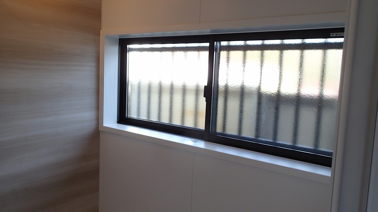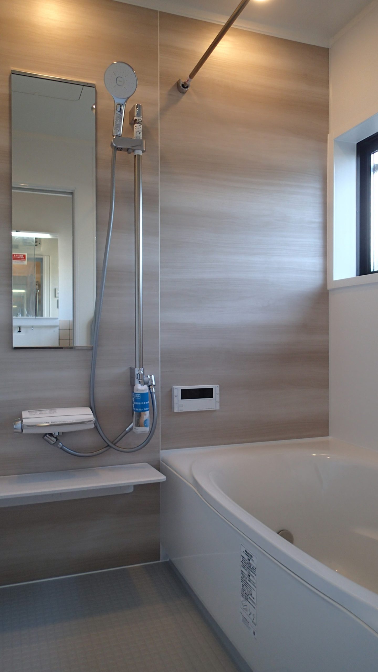 浴室リフォームと同時に浴室窓と給湯器も取替。浴室窓は浴室の端から端までピッタリになるように特注で制作しています。