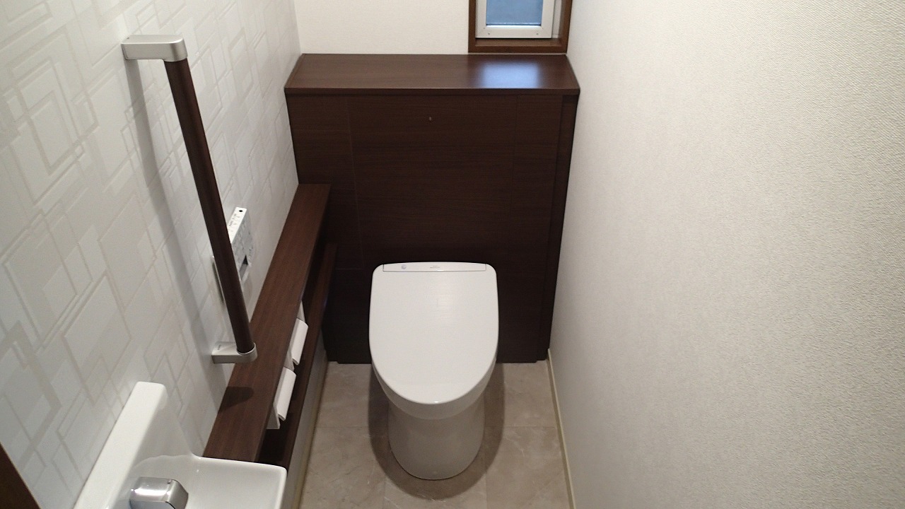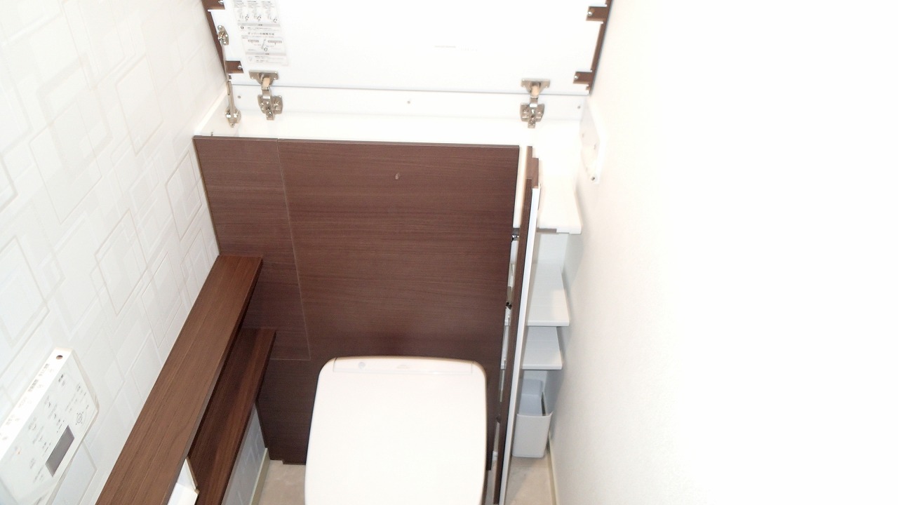 便フタの自動開閉や自動水栓の手洗いなど機能充実のトイレになりました。また沢山ものが入れられる収納も特徴の一つです。