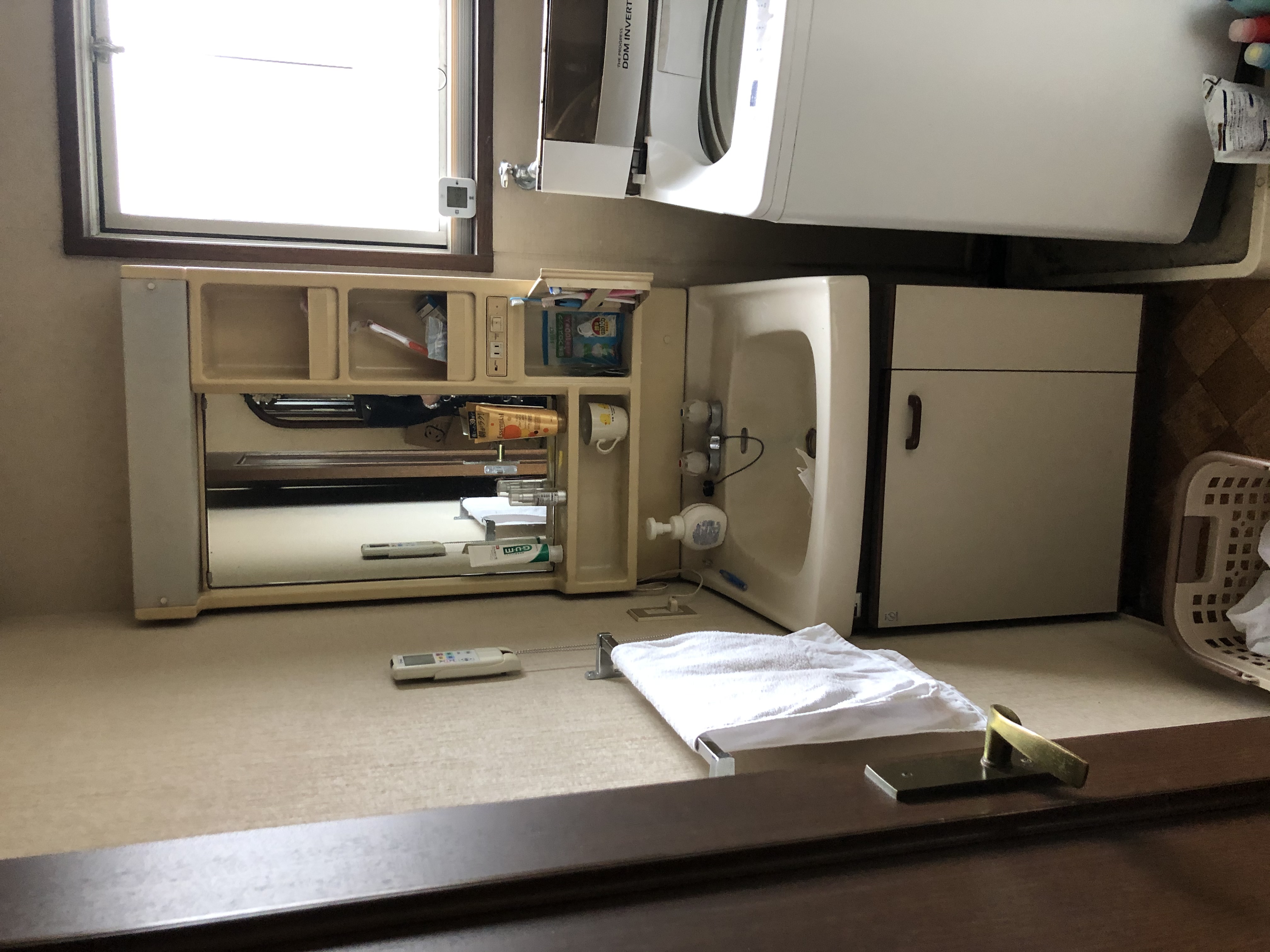 洗面台と内装、さらに洗濯機パンをW640に小さくすることで、化粧台との間に収納を置けるようになりました。