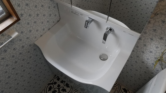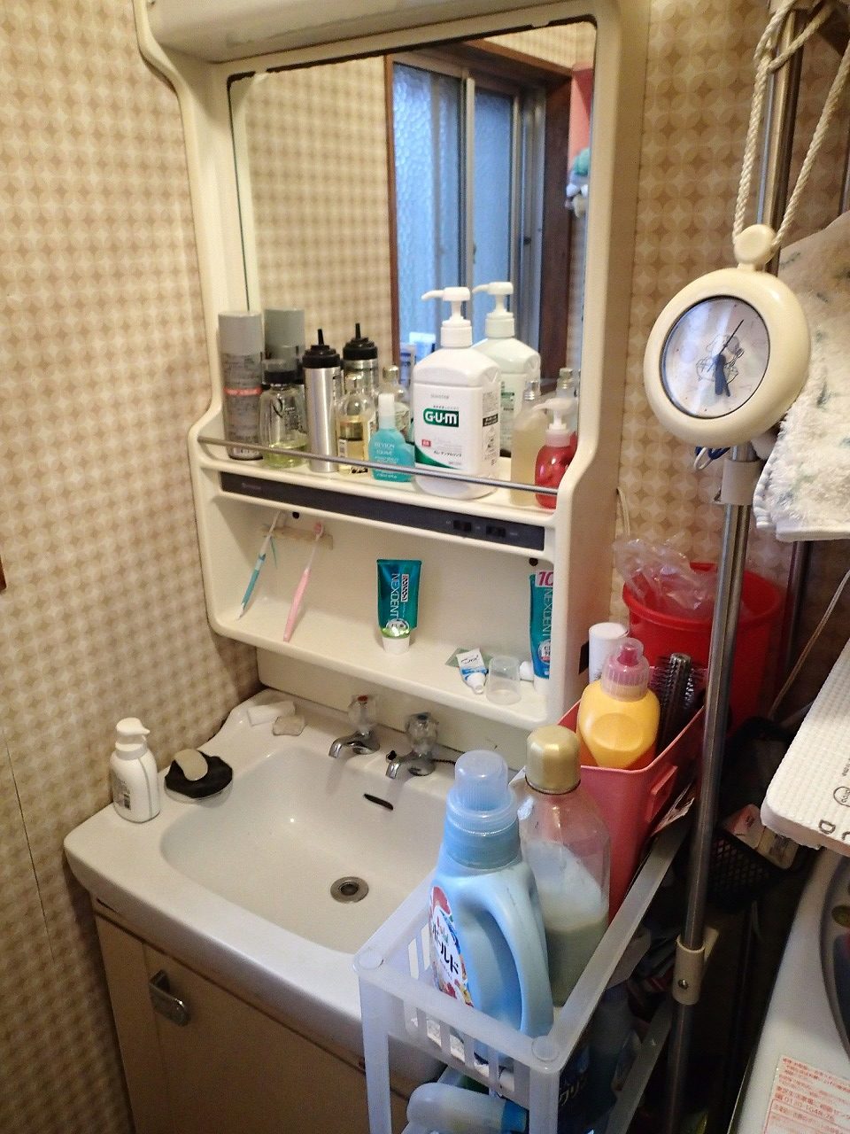0.75坪の脱衣室でも奥行のスリムな洗面化粧台(オクターブスリムW750)を提案設置させていただきましたので狭さを感じません。浴室リフォーム前に浴室に設置していた壁掛けタイプの浴室暖房乾燥機はまだ新しいので脱衣室に移設しました。