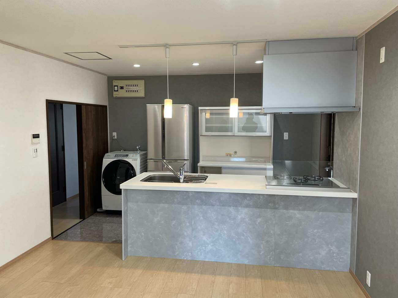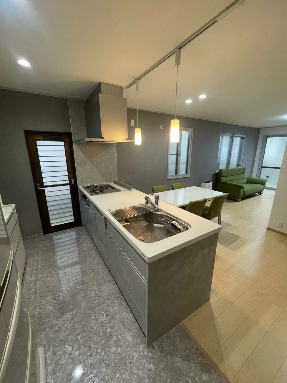 キッチン側とリビング側であえて床材を変えてキッチンを高級感ある形にしました。