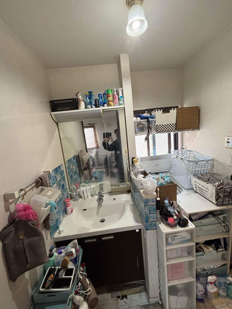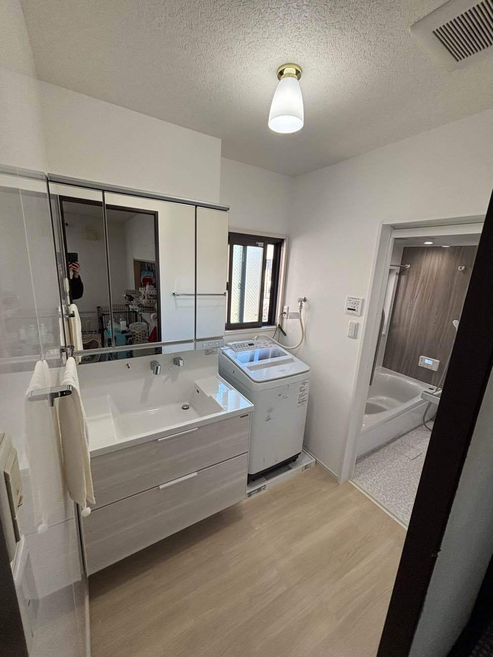 洗面化粧台と洗濯機の間の腰壁を無くすことで、大きな洗面化粧台入れ広々とした空間に作り替えることが出来ました。