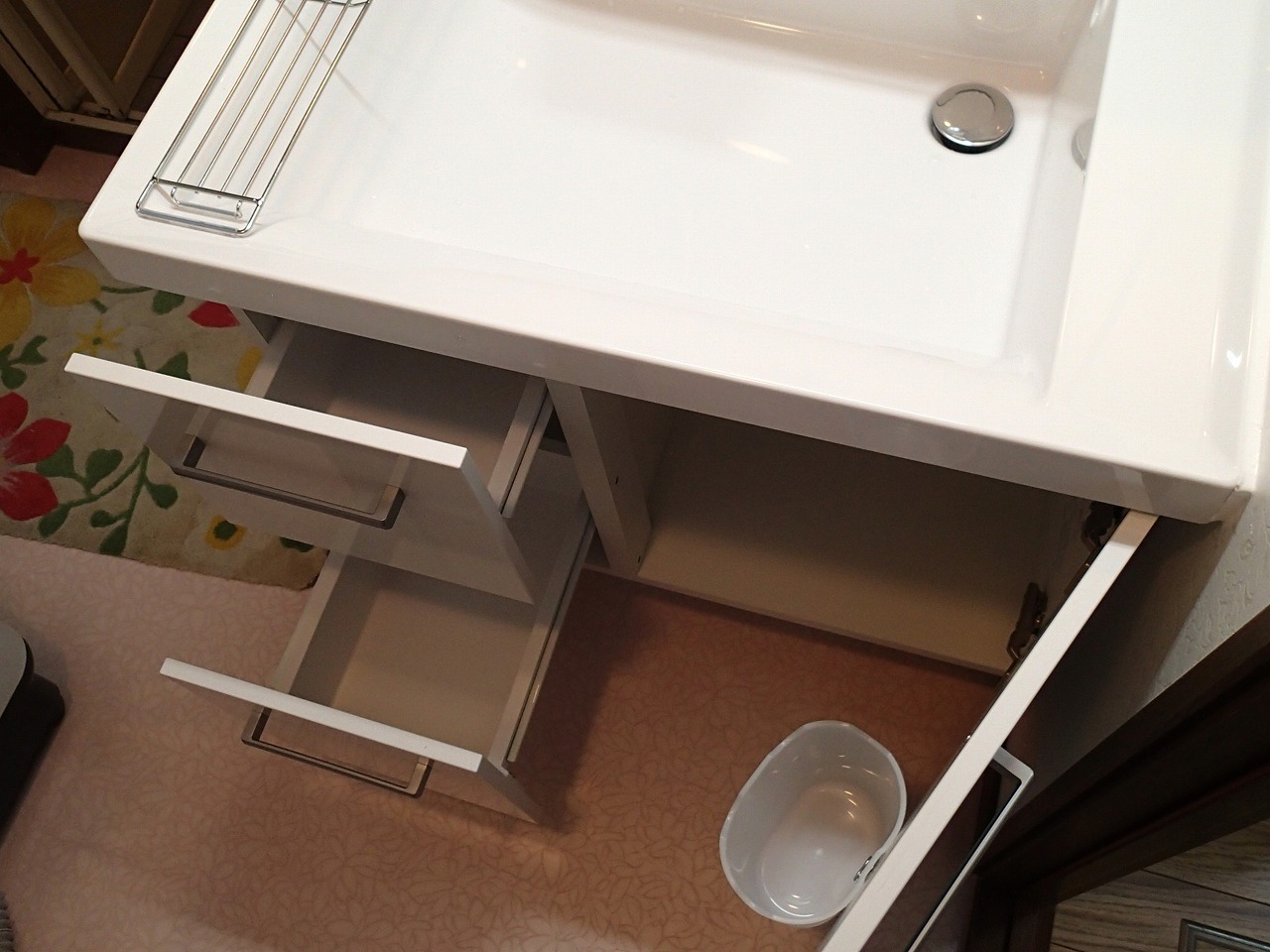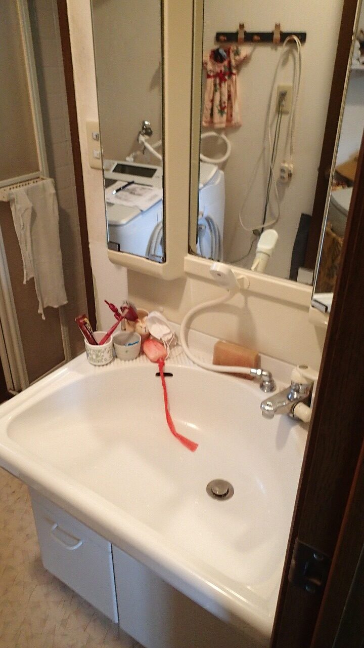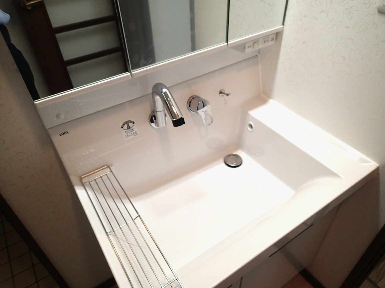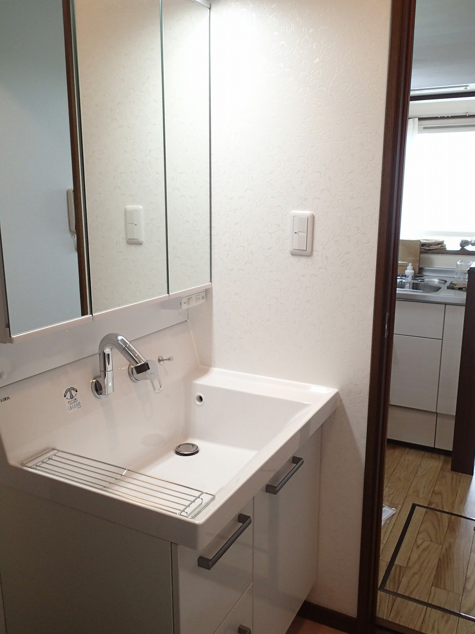 内装リニューアルの際に洗面化粧台の脱着が必要な為、古い洗面化粧台も一新することになりました。