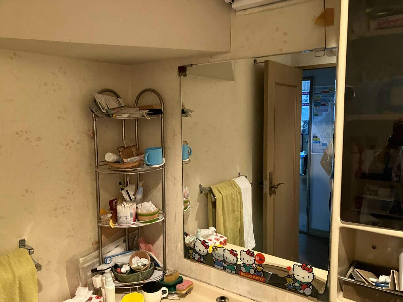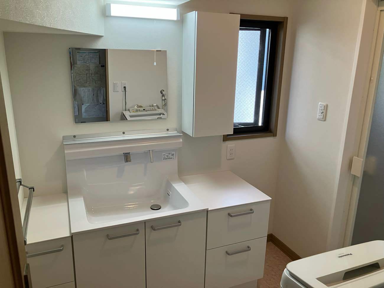 また、洗面所が階段下のため規格の化粧鏡の取付ができないため、単品で鏡を選定し取付。