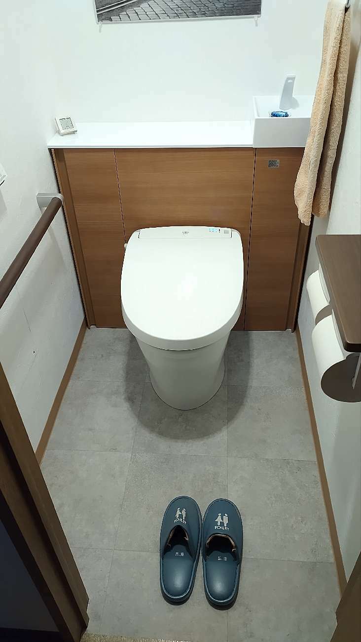 しまう場所がないため仕方なくそのままになっていた掃除道具の収納場所を、キャビネット付きトイレにすることで解決しました