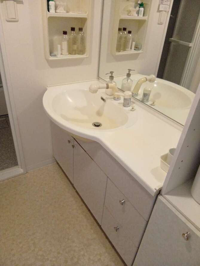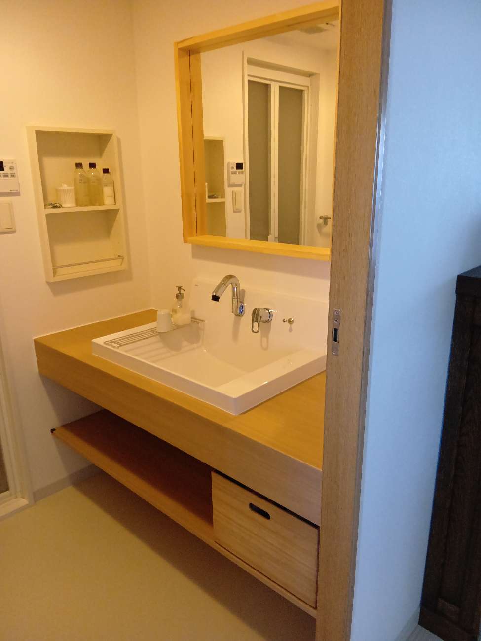 マンション備付の造作洗面台からの更新は規格品ではサイズが合わない、、、、とお悩みでした