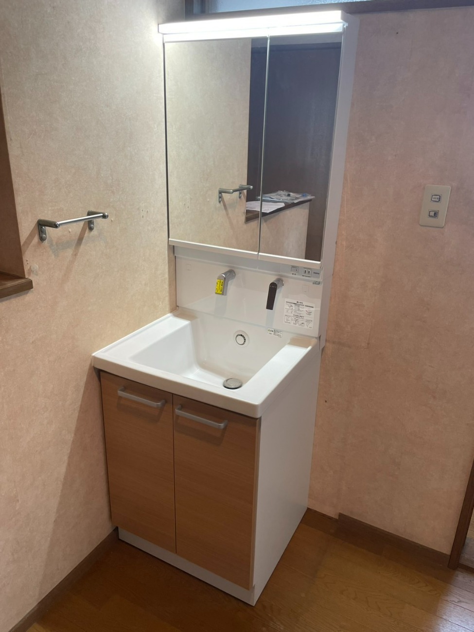 廊下の手洗器用化粧台の設備老朽化と水栓部からの水漏れでお困りでした。
