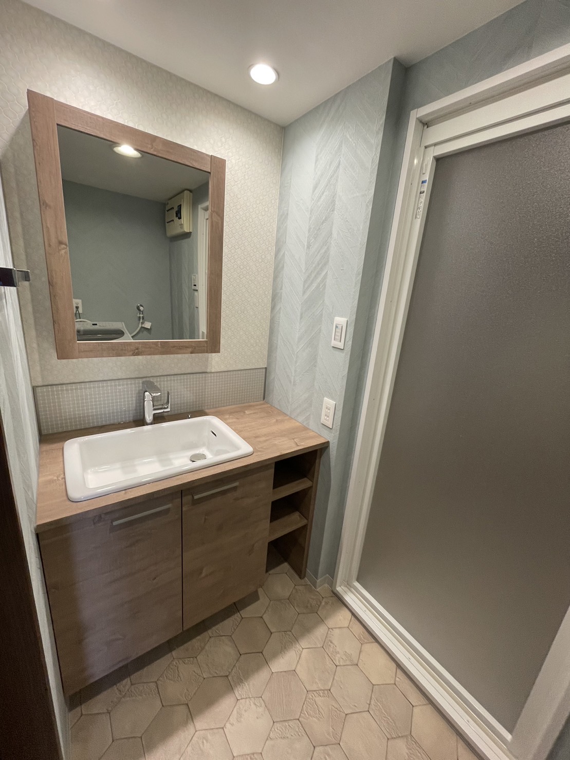 ミラーもコンセントがあり機能的で、とても存在感のある洗面空間になりました。