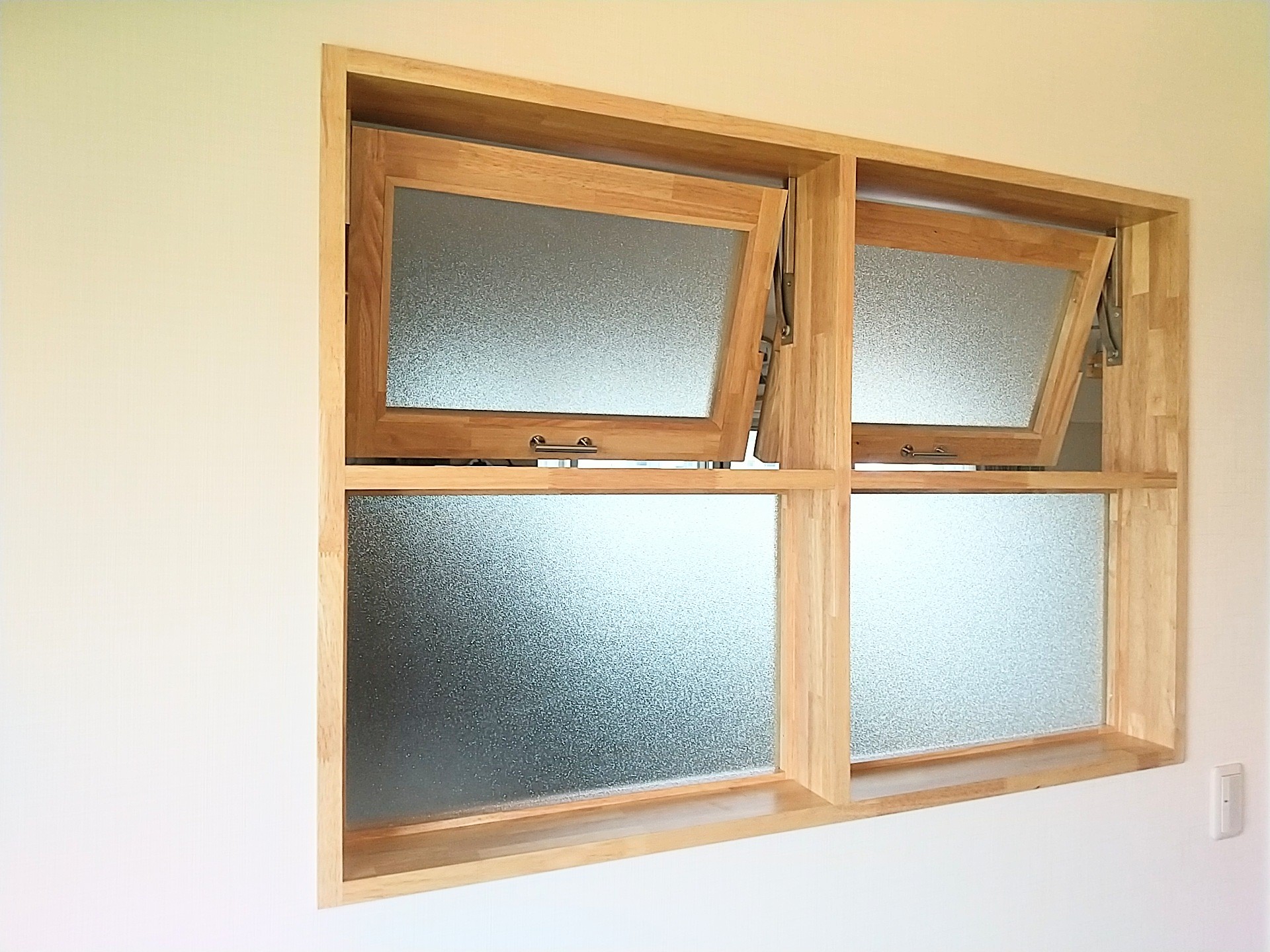 上部を突き出し窓にし通気性をUP、ガラスは透明ではなく型ガラスとし、