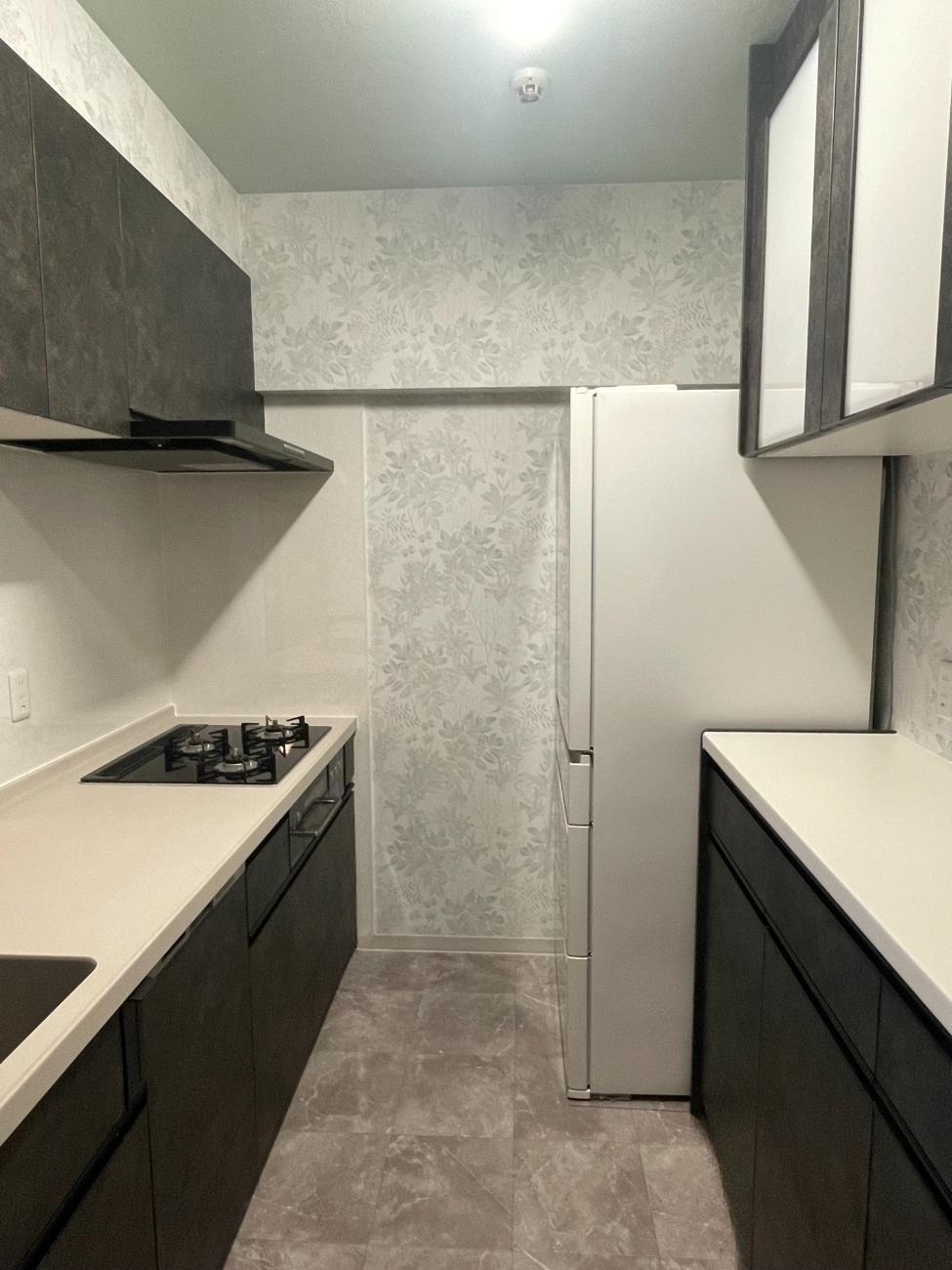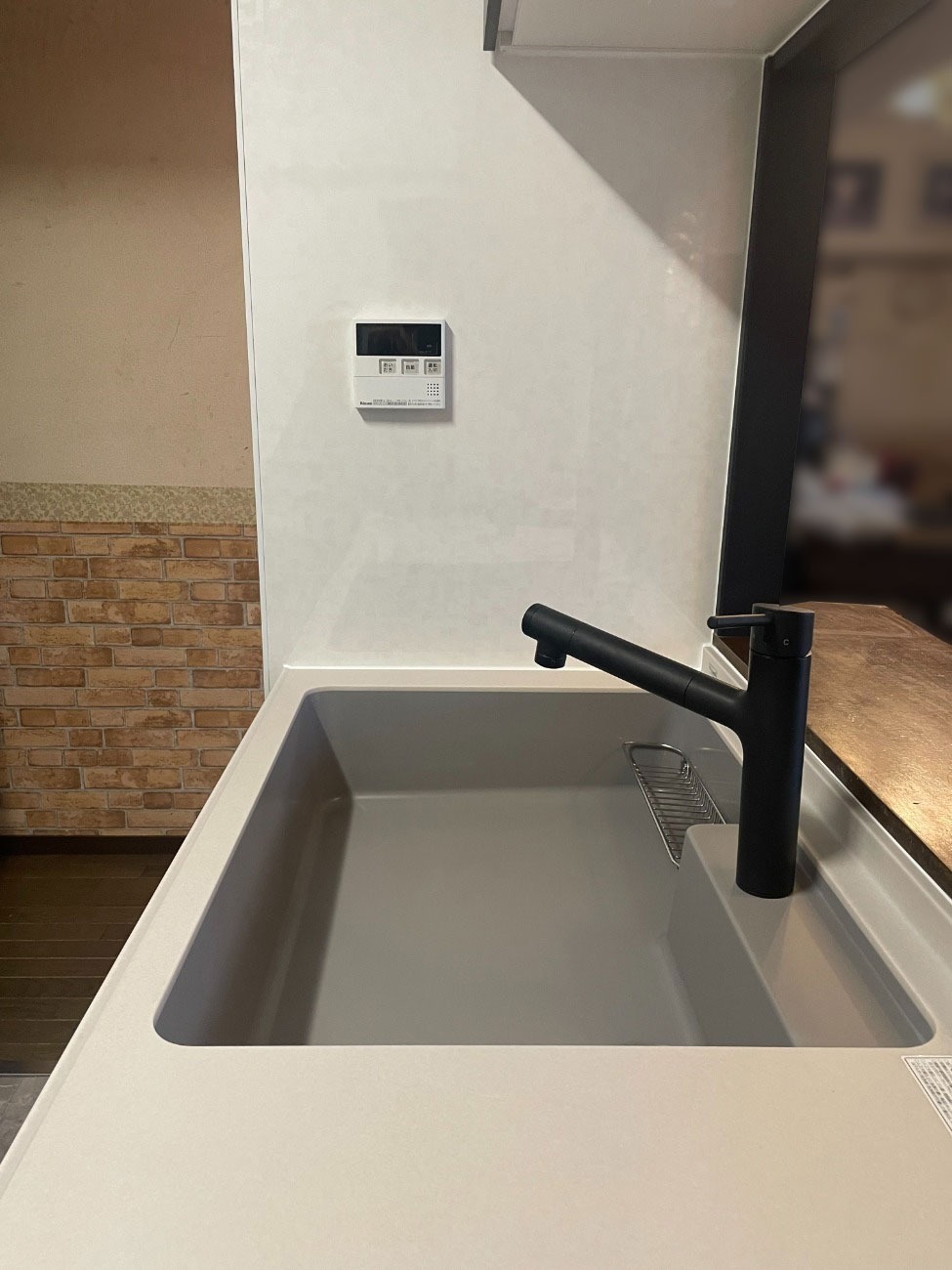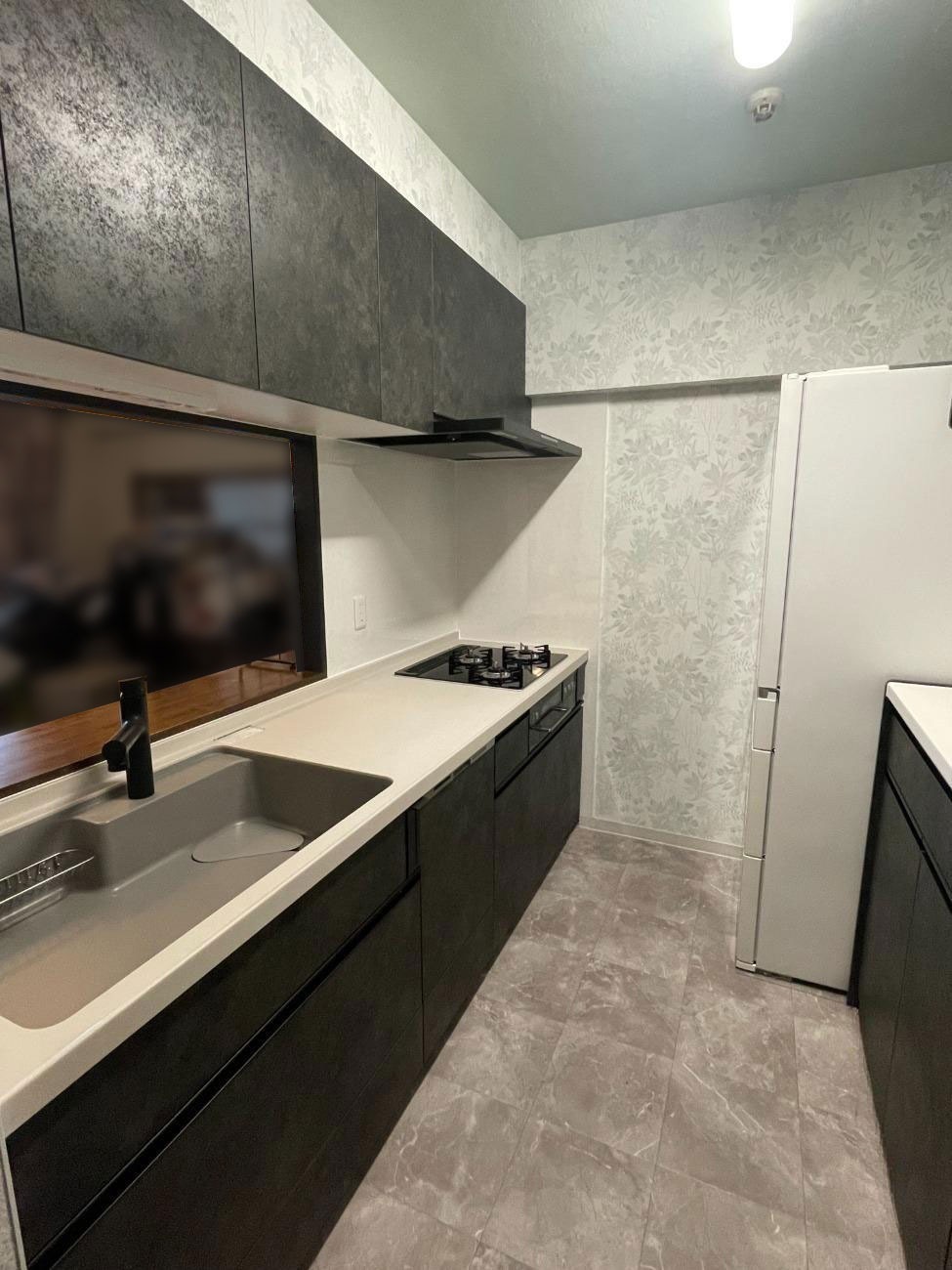 システムキッチンの扉柄に合わせて、グレー系でコーディネートしております。