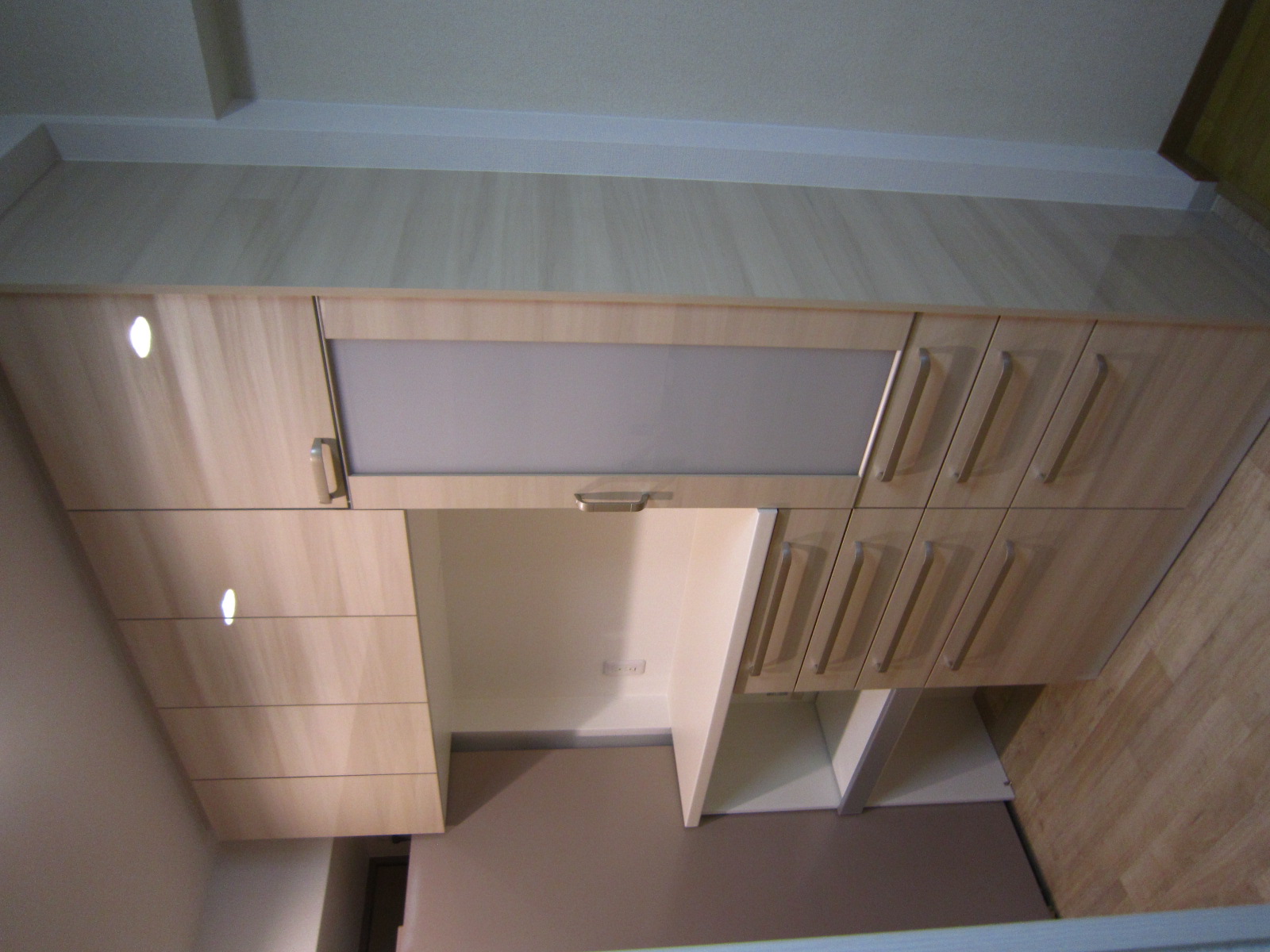 収納力は、システムキッチンの引き出し収納で強化しました。またカップボードも使い勝手を考えてセミオーダー。