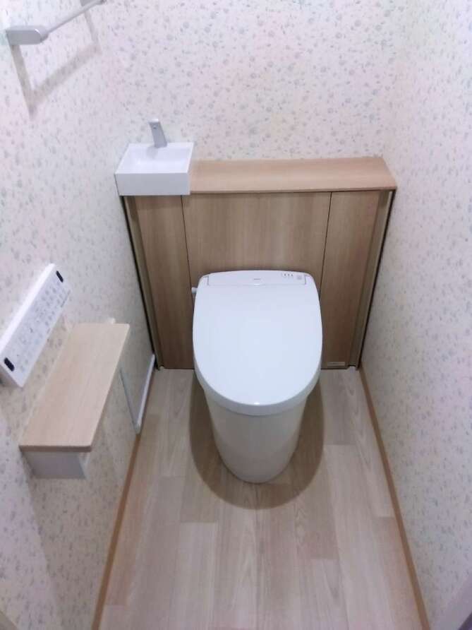 • トイレ背面収納と床クッションフロアの色柄を合わせました。