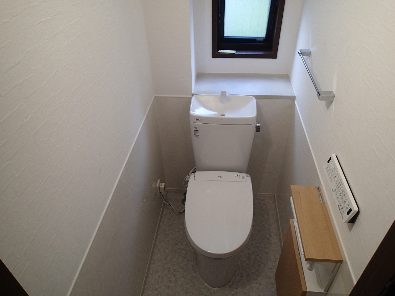 よく使う1階のトイレはフルオート便座のシャワートイレ、腰下には汚れを簡単に拭き取り掃除ができるメラニンパネルを貼りました。もちろん便器は超節水なので水道代の節約にも期待が出来ます。