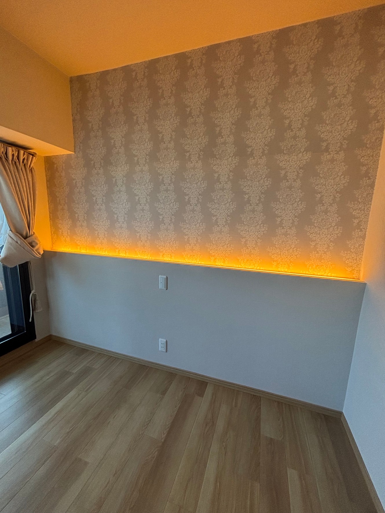照明上部のみアクセントのクロスにしたので、日が落ちてから照明をつけると落ち着いた雰囲気に
