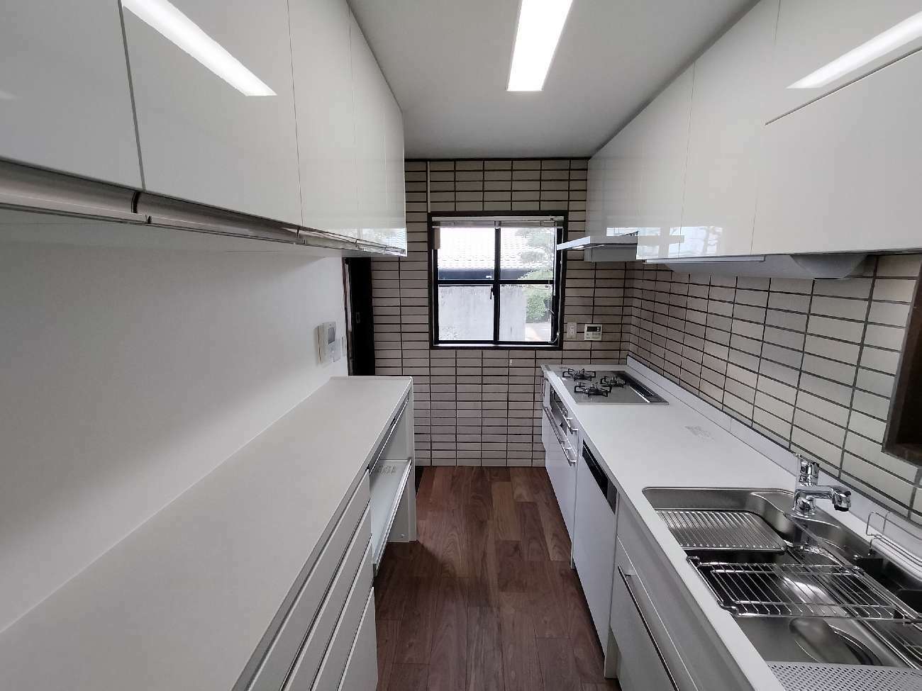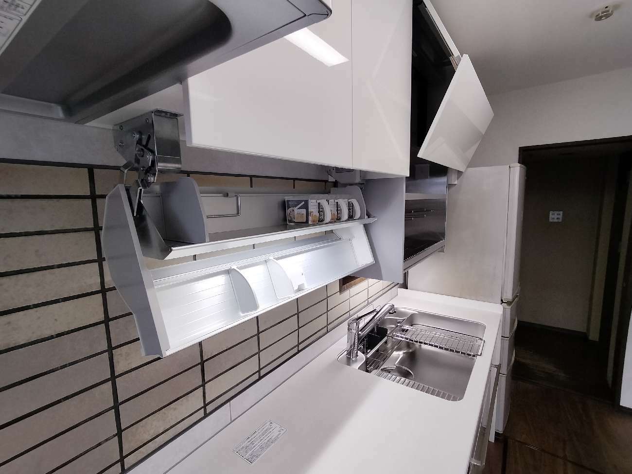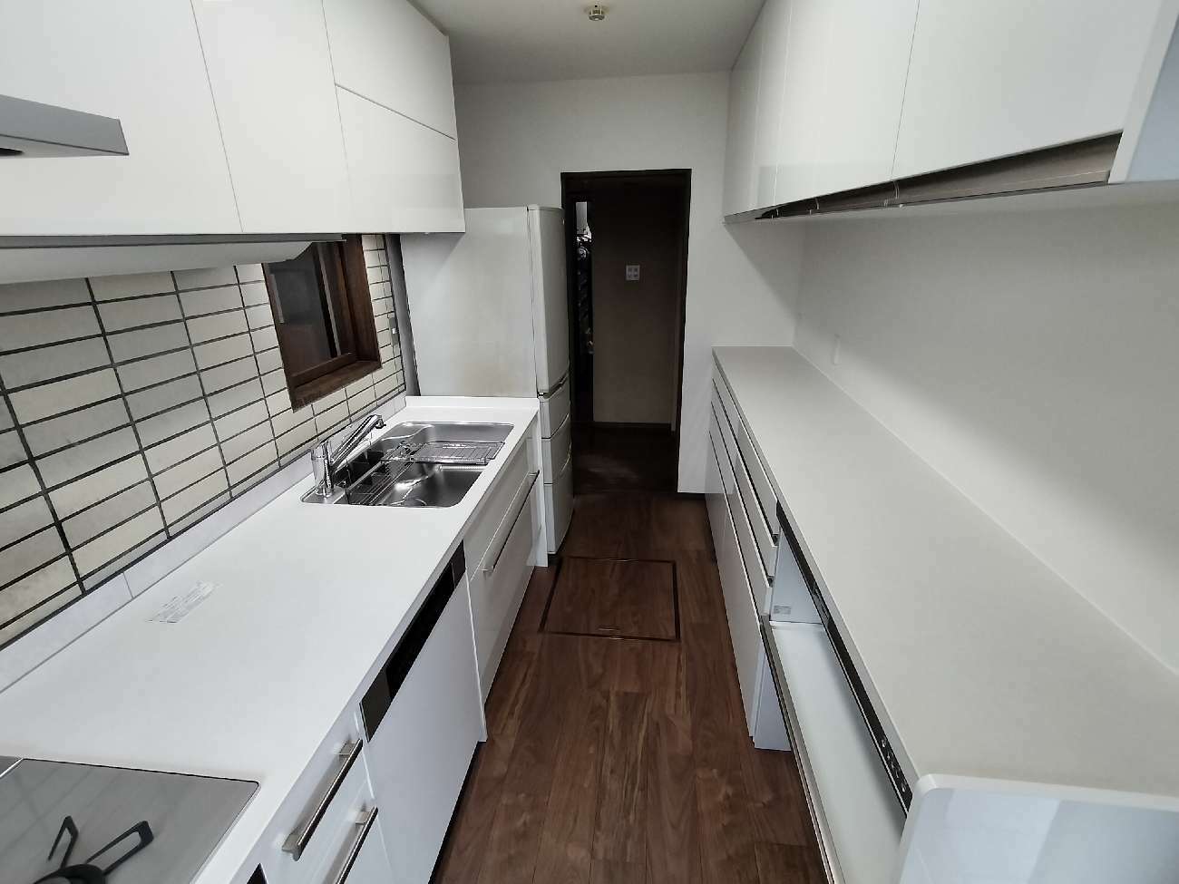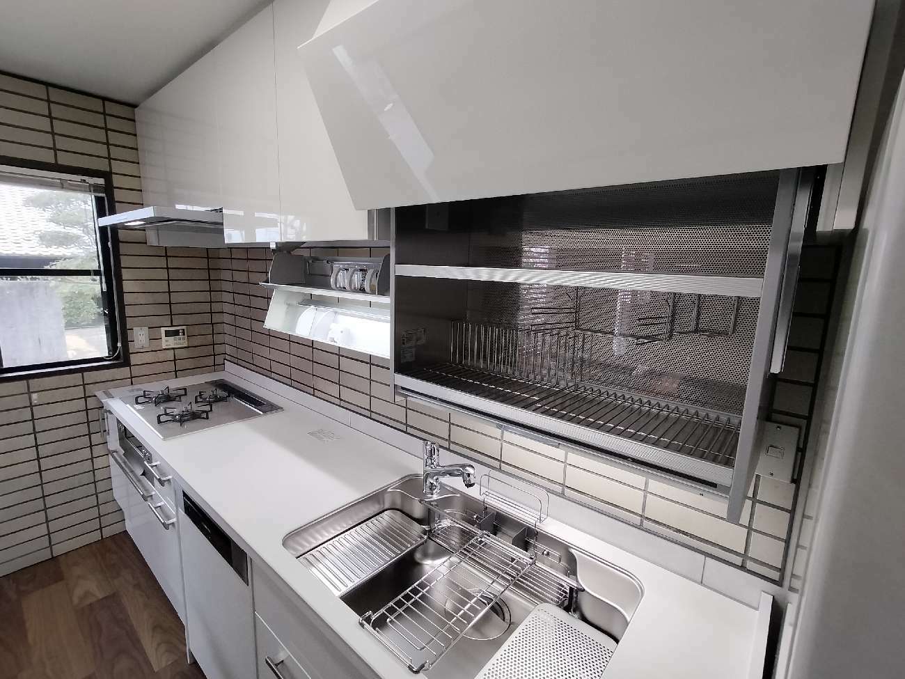 思い入れのある壁タイルは残しつつ傷んだ床は貼替て一新、ミストホワイトの光沢扉も相まって明るい清潔感のある空間となりました。
