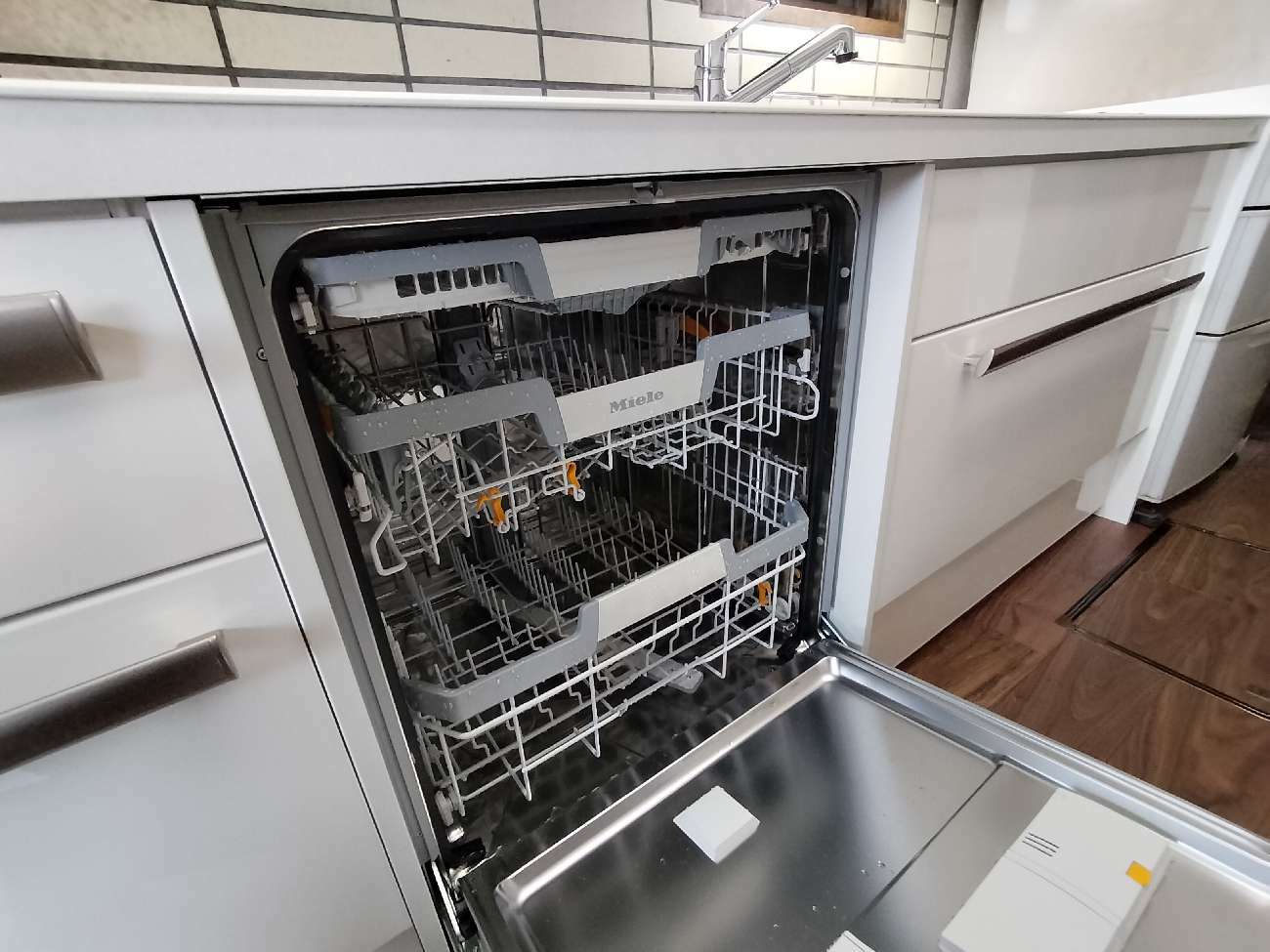 キッチン本体、収納部も天板はセラミック。ミーレの60㎝幅の大容量食器洗い乾燥機や電動昇降水切りユニットなど至れり尽くせりの仕様のキッチンです。