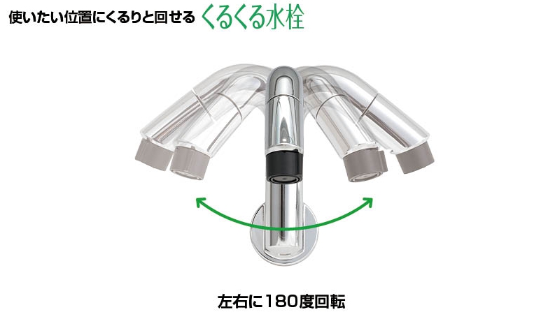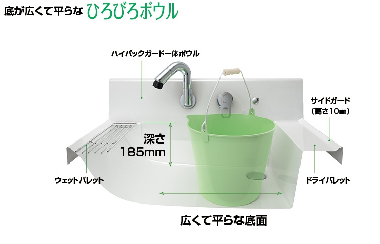 ひろびろボウル、くるくる水栓で機能的な洗面化粧台です。またボウルの溢れ面高さは3段階からお選びいただけます
