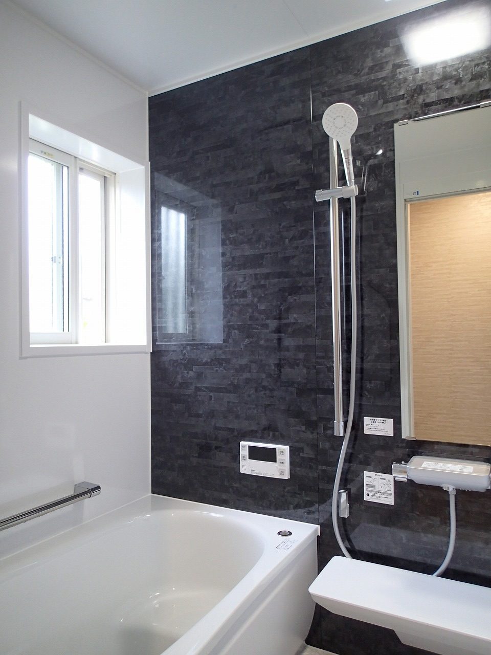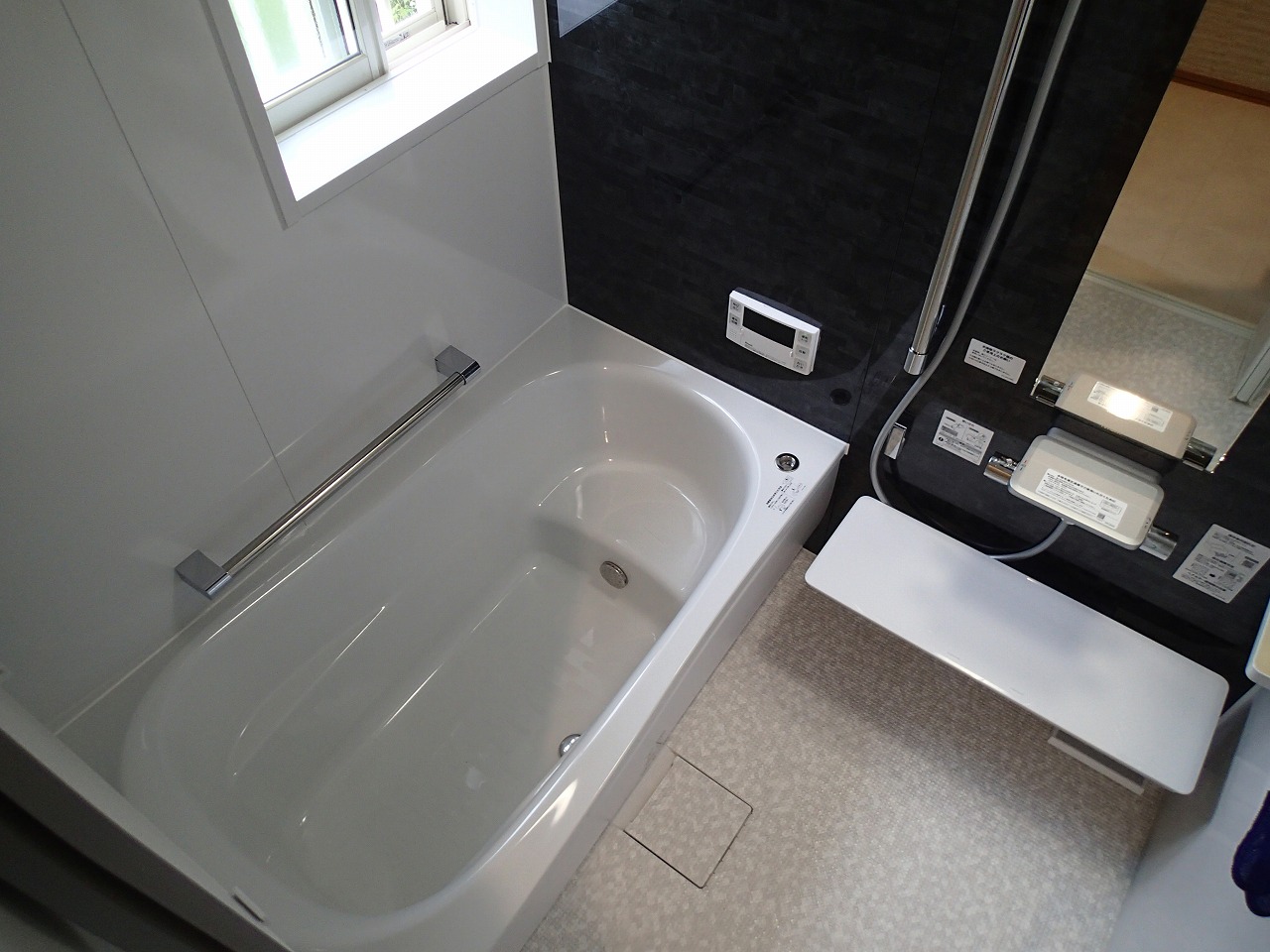 リフォーム前の浴室空間が通常のシステムバスにはにはない特殊な寸法だったため隣接するトイレの壁を撤去して設置スペースを広げ、さらに戸建て用のシステムバスでは丁度良いサイズの設定が無い為マンション用のユニットバスを設置しました。またレイアウト上浴槽の向きも変更しました。