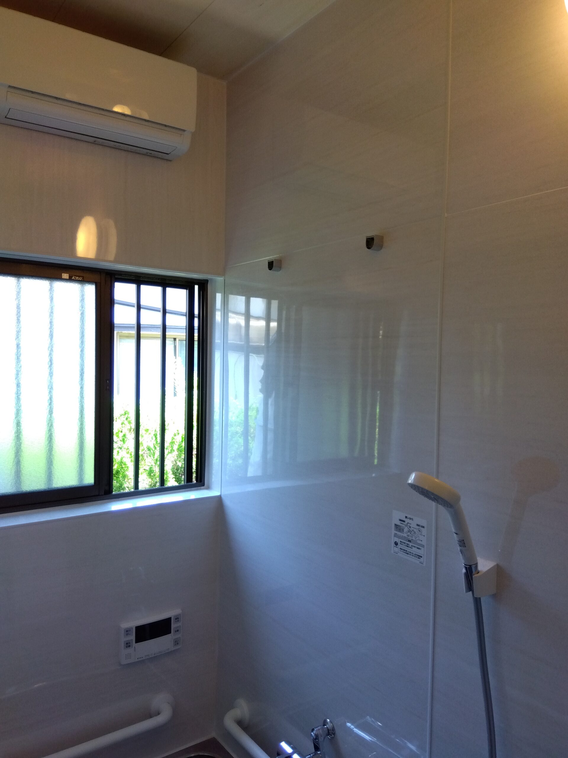 タイル壁の浴室で、サイズ的にシステムバスへの工事ができなかったのでパネルを張る工事となりました。