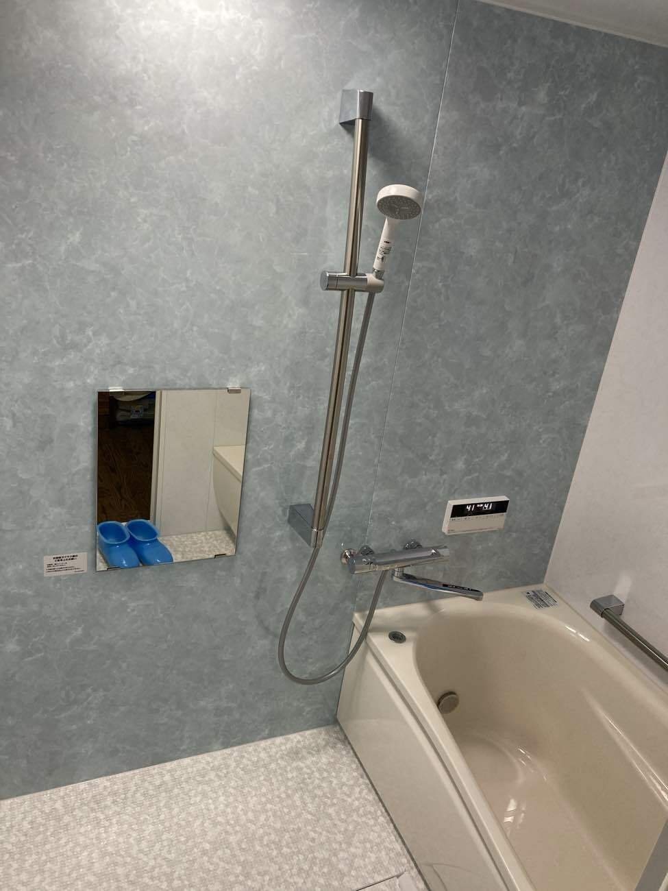 壁が寒色系ですが、浴槽をベージュにされたので、とても温かみのある浴室になりましたね!