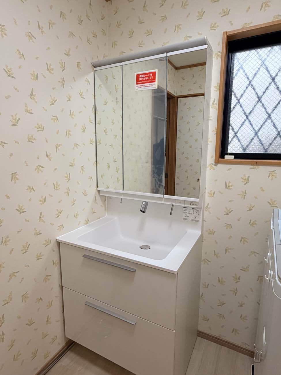 窓の関係で幅90センチの洗面台を置くことはやめ、お客様自身で収納を買い、置くことになりました。