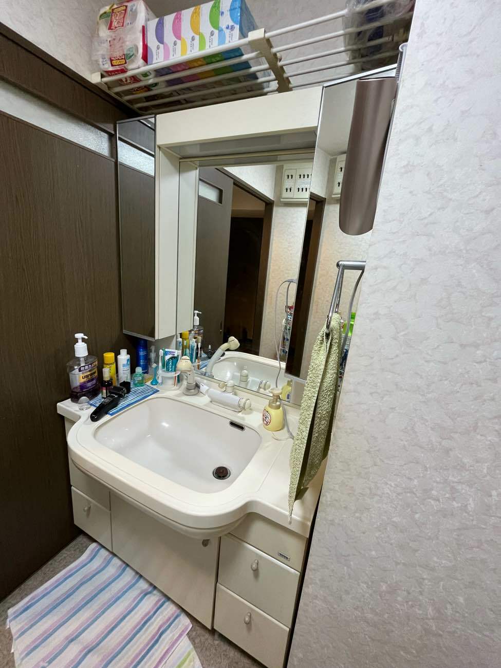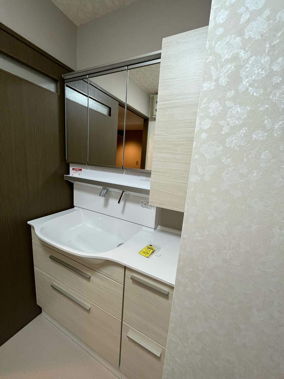 1枚鏡から鏡裏収納付きのものに変更し、横幅いっぱいの収納を取り付けました。