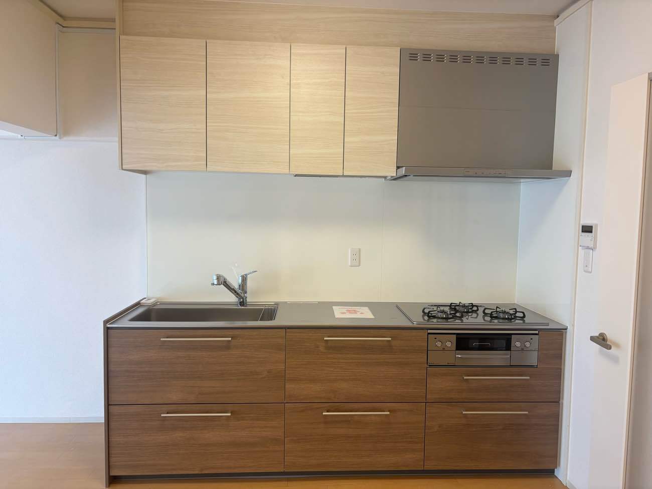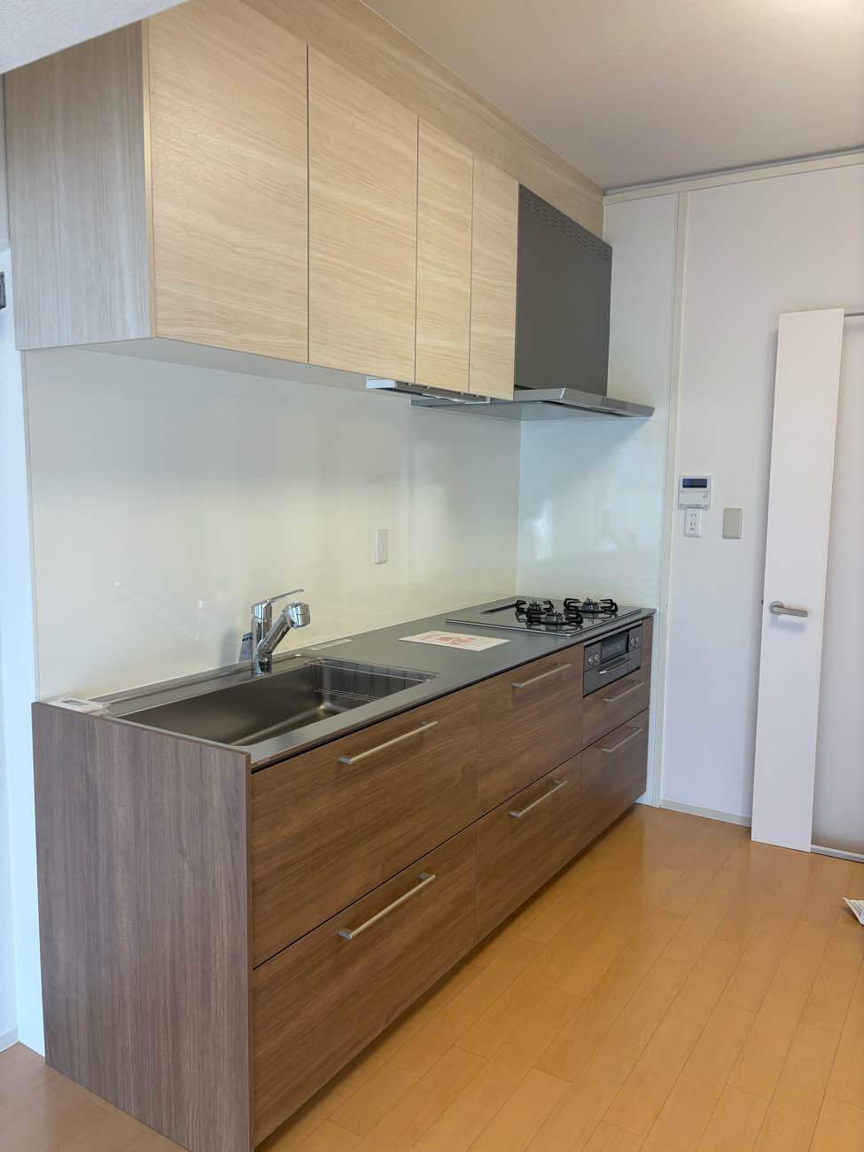あえて吊戸棚と本体の色を変えました。どちらも木目にすることで統一感のある