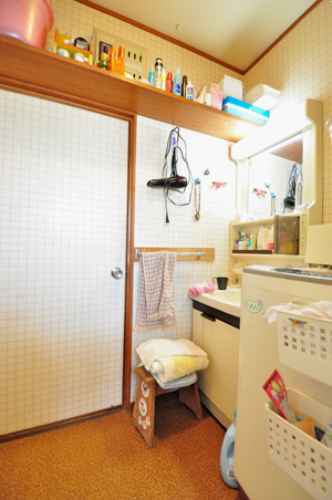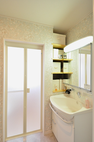 明るく清潔感のある水廻り。和室収納だった部分に洗面器と棚を取り付けたので、洗面所はかなり広くなりました。