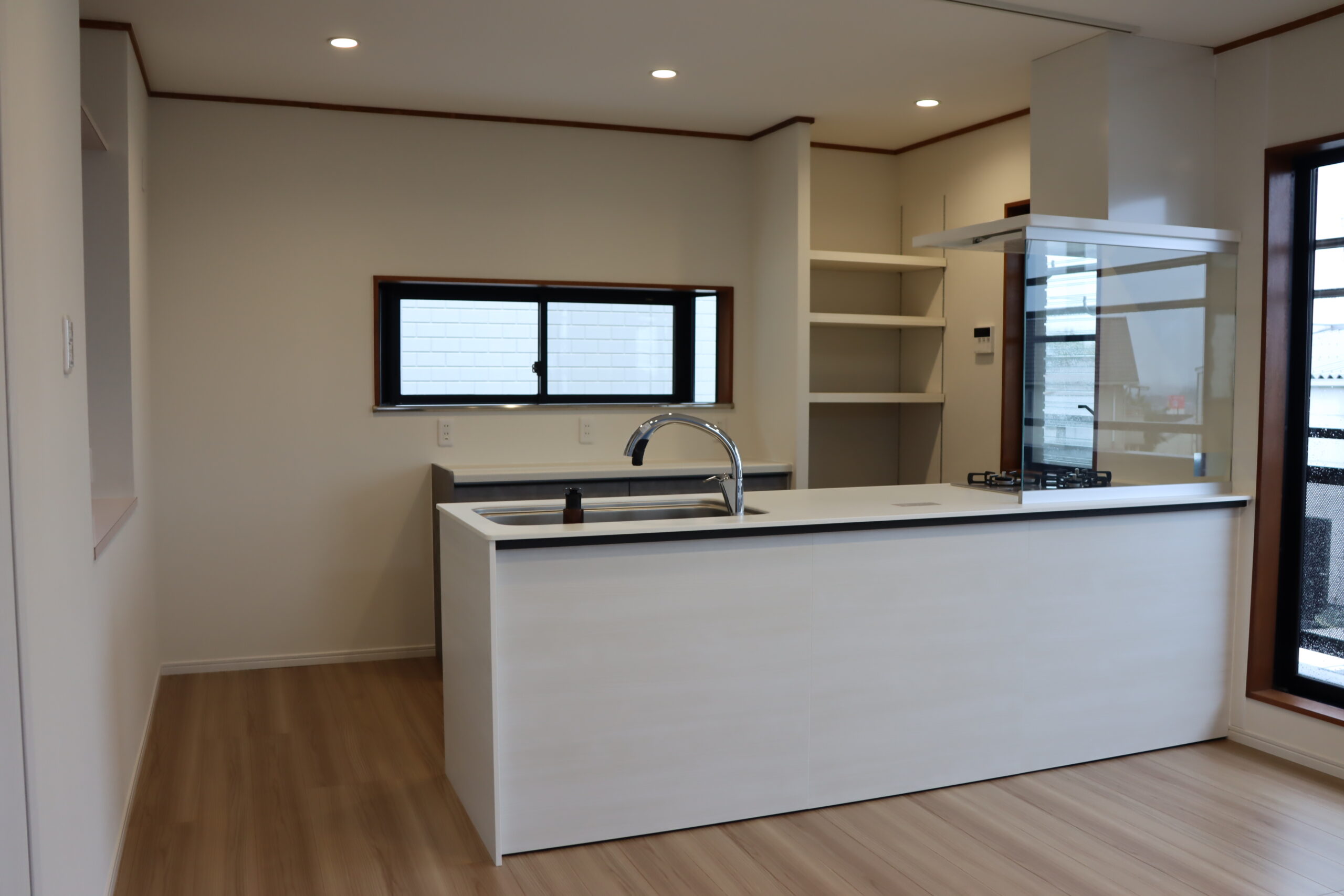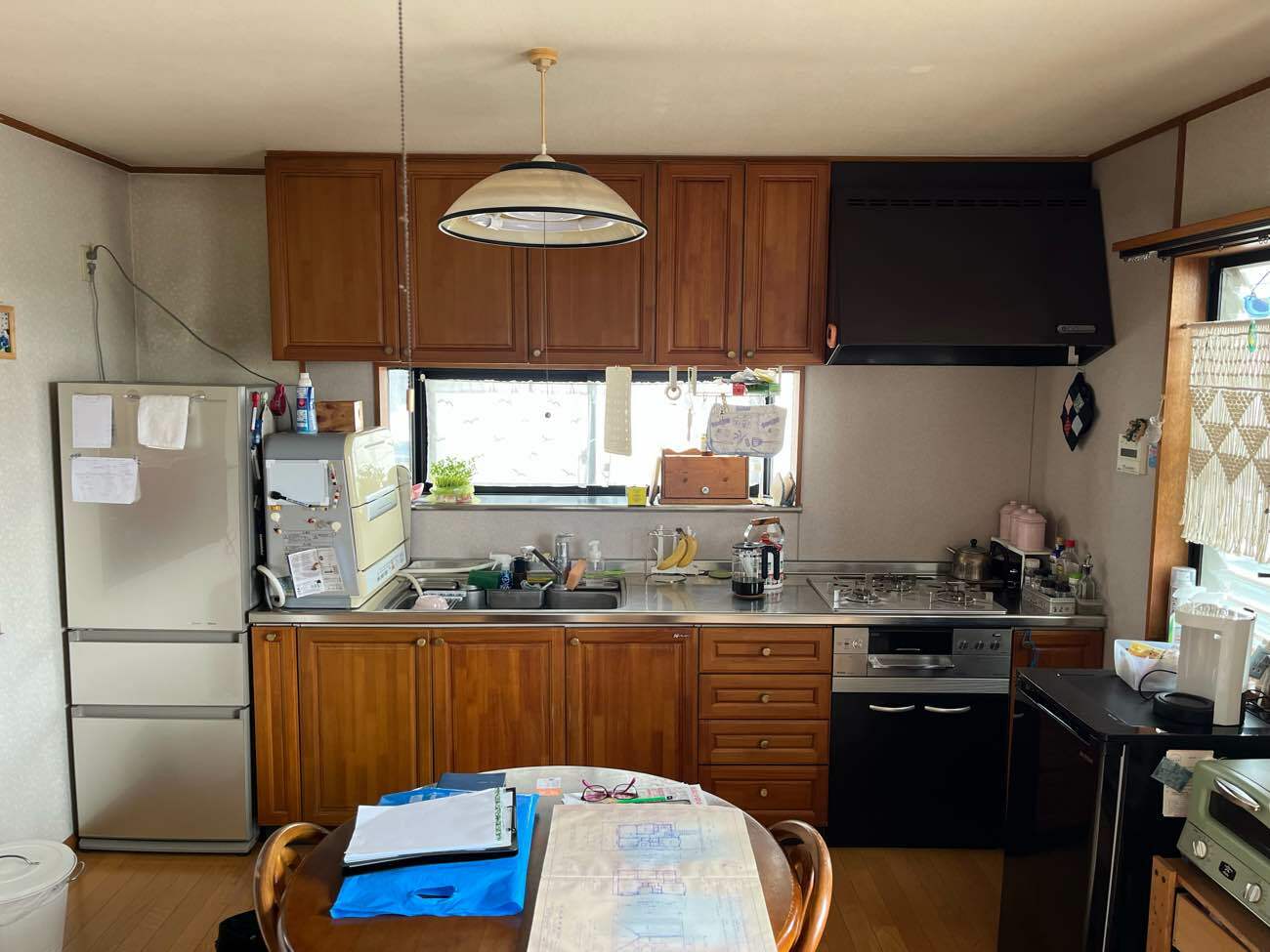 リビングにいるワンちゃんたちを見ながらお料理ができるように、壁付けのキッチンからフラット対面のシステムキッチン(LIXIL/シエラ、W=2574)へ取替え。背面には造付けの収納を設置。可動棚も設置して買い置き品のサイズに合わせて高さの調整ができるように。