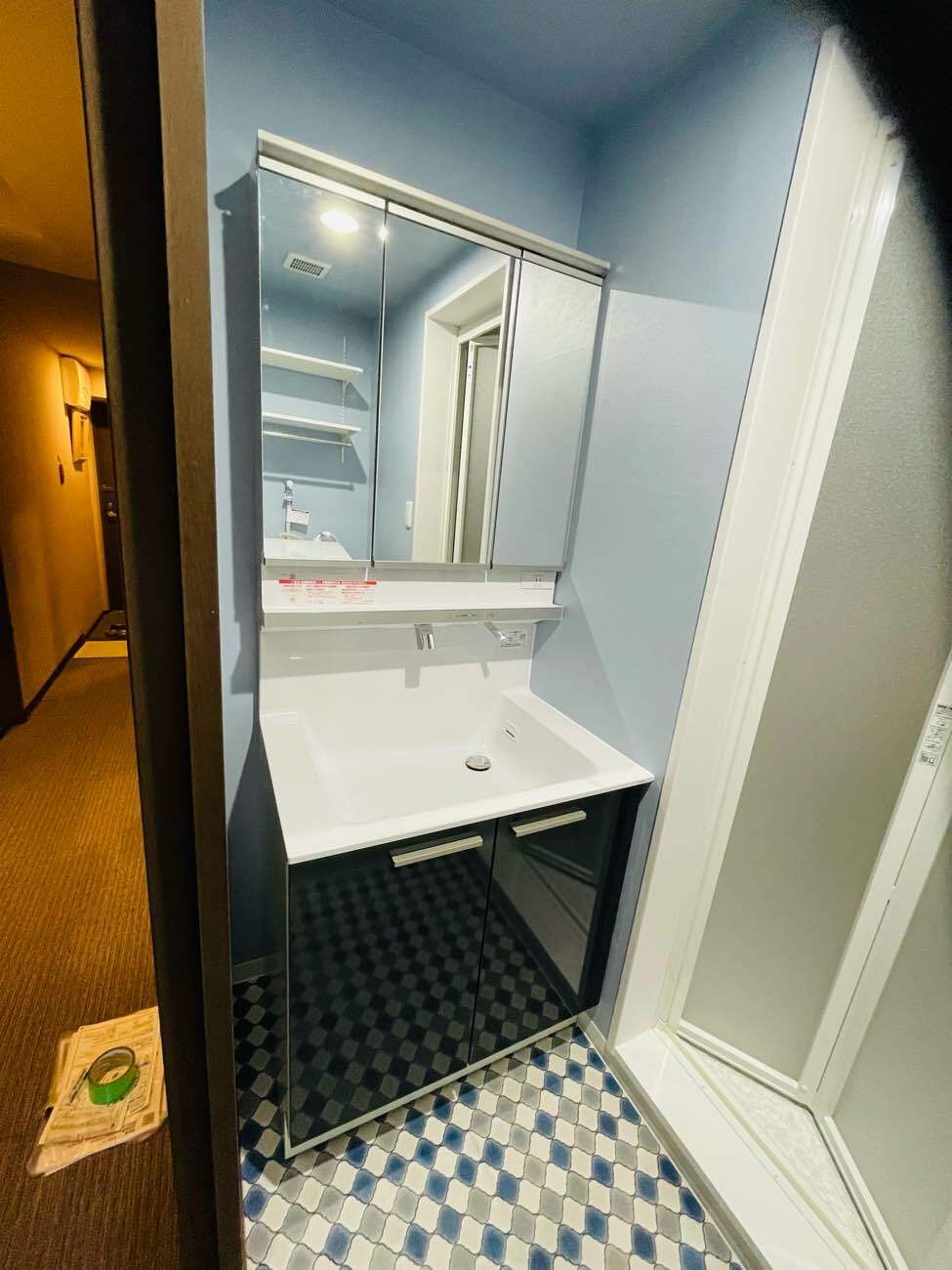洗面化粧台の取替を以前から検討していたが気に入ったものが寸法的に入れられなかったとのこと