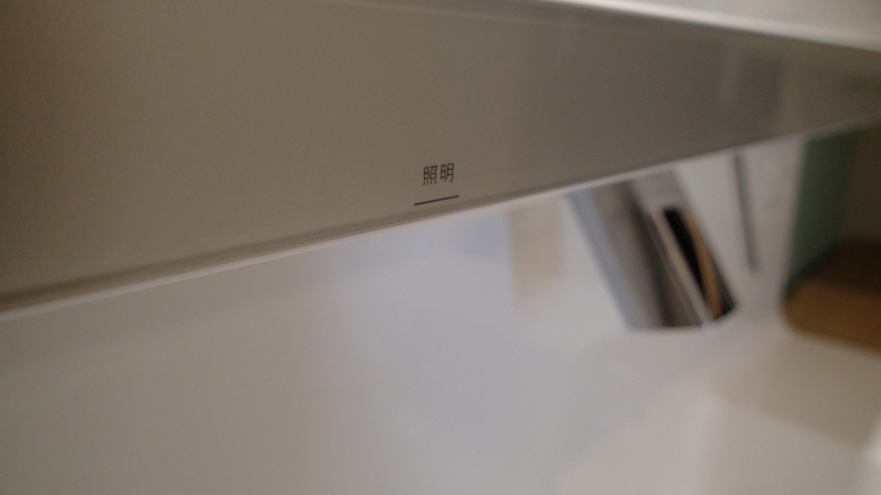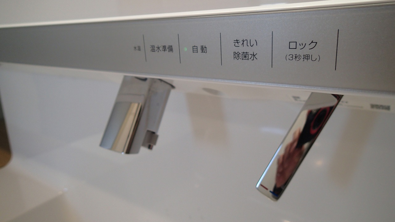 幅1メートルの大きな洗面化粧台は余裕があり使い勝手抜群。タッチレスで照明も吐水もできるタイプです。